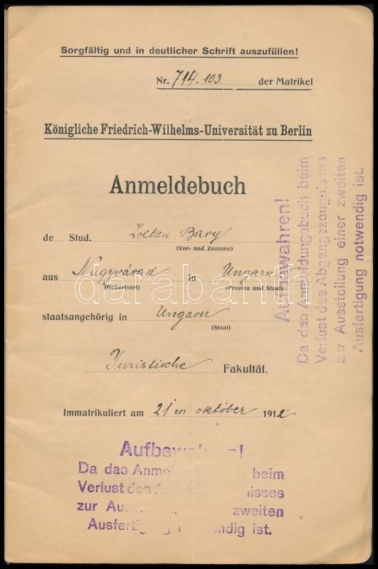 1912 Berlini Egyetem leckekönyve magyar személy részére https://www.darabanth.com/hu/427-Gyorsarveres/427.0/Mutargy-papirregiseg-egyeb/Okmanyok~500019/1912-Berlini-Egyetem-leckekonyve-magyar-szemely-reszere~II2727505