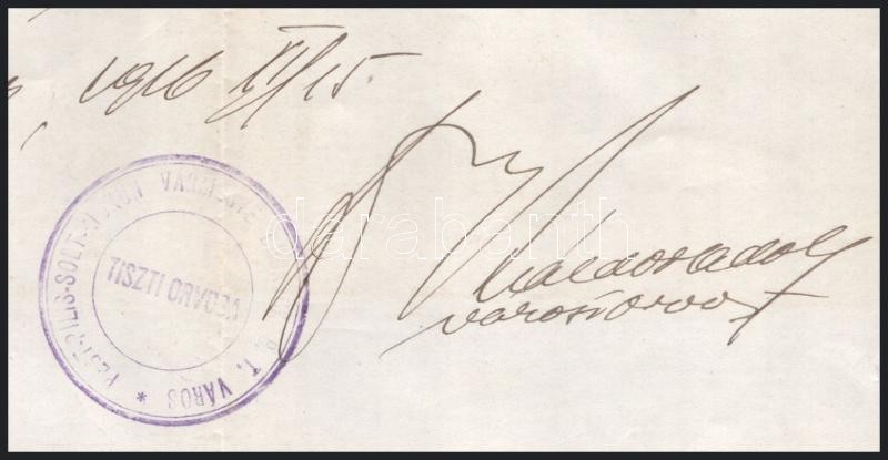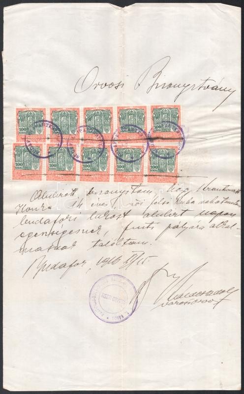1916 Bp., kézzel írt orvosi (alkalmassági) bizonyítvány, "Pest-Pilis-Solt-Kiskun vármegye Budafok R. T. város tisztiorvosa" bélyegzővel, aláírással, illetékbélyegekkel