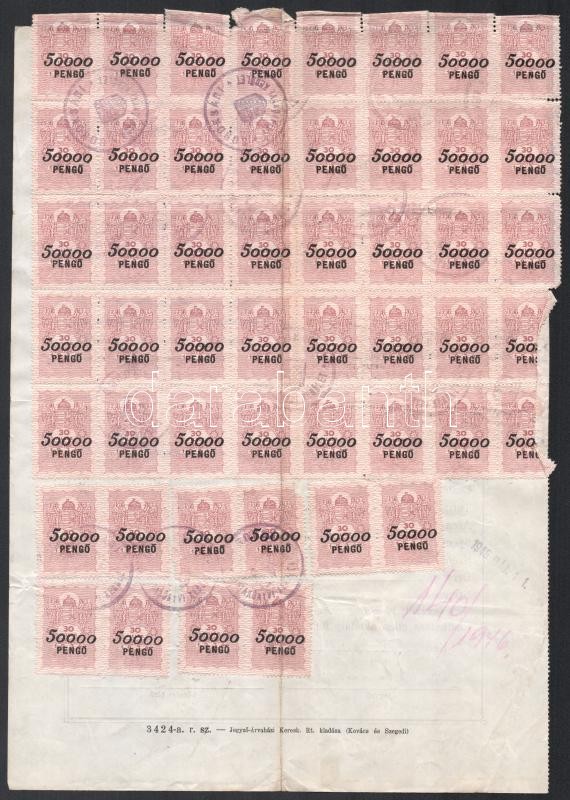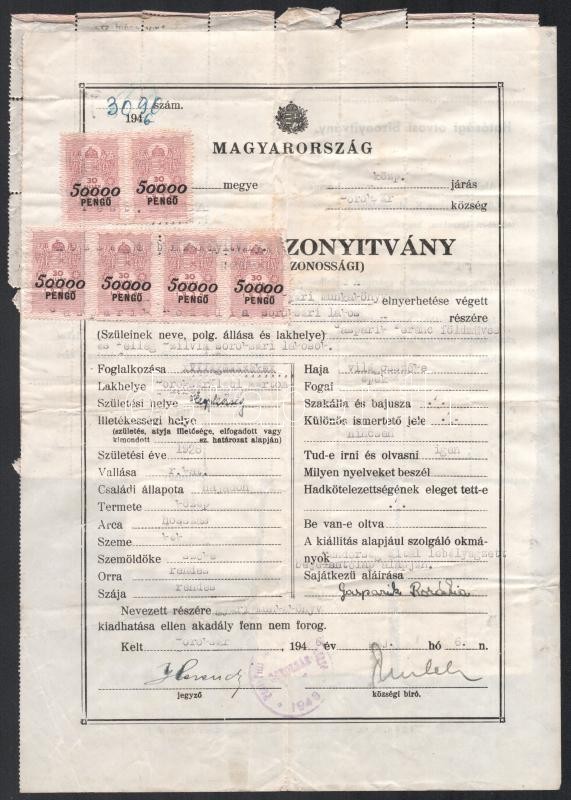 Leírás: 1946 Soroksár, községi bizonyítvány (személyazonossági), aláírásokkal, 56 db felülnyomott pengő-inflációs illetékbélyeggel