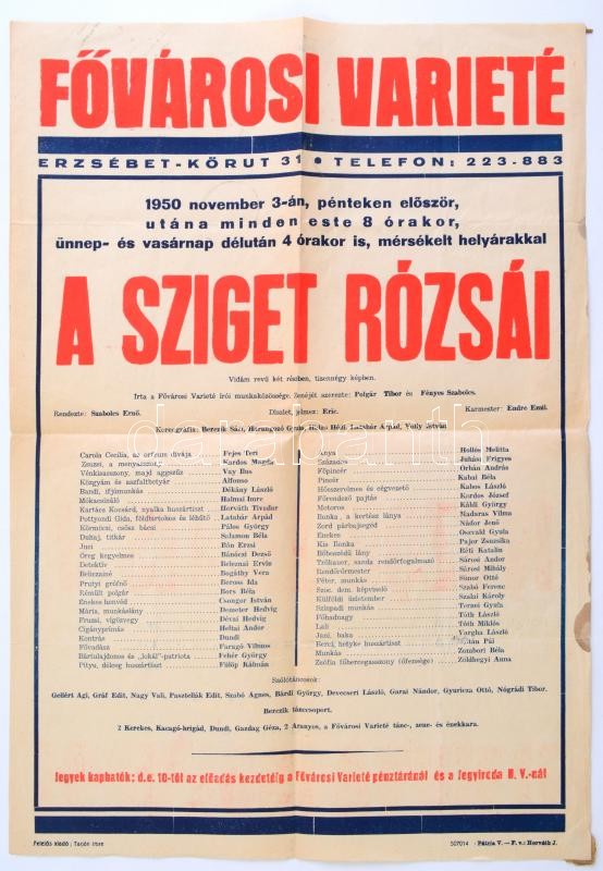 Leírás: 1950 Fővárosi Varieté - A sziget rózsái előadás plakátja, hajtott, foltokkal, 42x30 cm