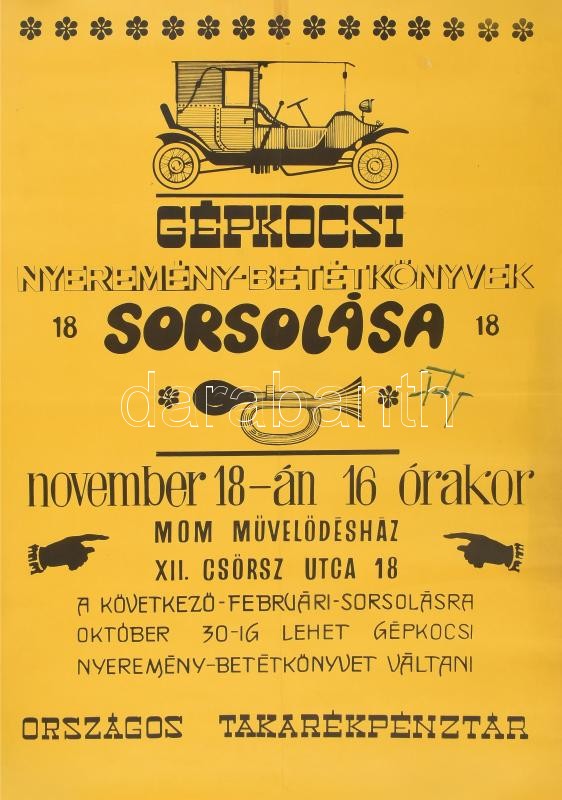 cca 1970 Gépkocsi nyeremény betétkönyv sorsolás a MOM Művelődési Házba... https://www.darabanth.com/hu/427-Gyorsarveres/427.0/Mutargy-papirregiseg-egyeb/Plakat~1500004/cca-1970-Gepkocsi-nyeremeny-betetkonyv-sorsolas-a-MOM-Muvelodesi-Hazban-plakat-feltekerv~II2733889