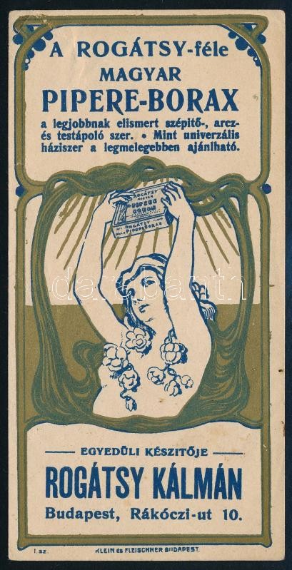 Rogátsy-féle magyar pipere-borax szecessziós számolócédula https://www.darabanth.com/hu/427-Gyorsarveres/427.0/Mutargy-papirregiseg-egyeb/Reklam~500023/Rogatsy-fele-magyar-pipere-borax-szecesszios-szamolocedula~II2735594