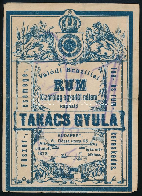 Leírás: Valódi brazíliai rum - Takács Gyula Budapest VI. Rózsa utca címke, hajtott