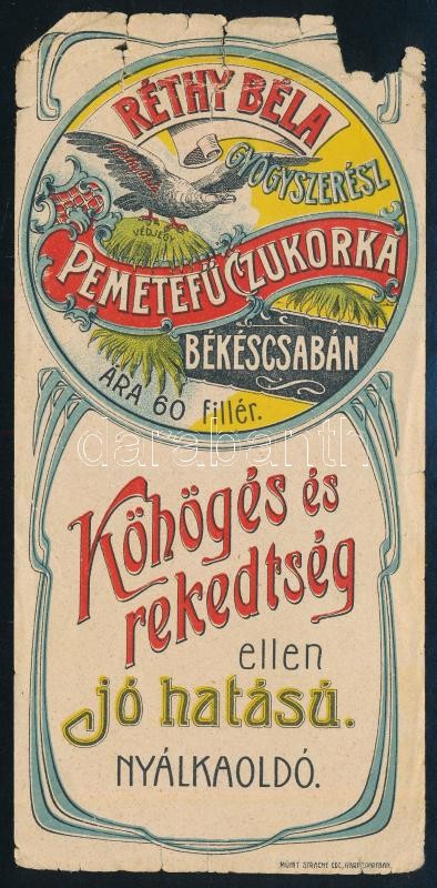 cca 1910-1920 "Réthy Béla Gyógyszerész Permetefűczukorka Békéscsabán. Köhögés és rekedtség ellen jó hatású nyálkaoldó", szecessziós számolócédula, sérült