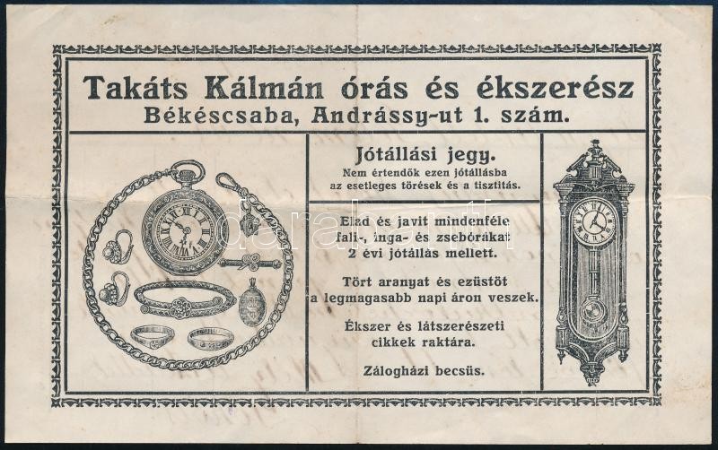 cca 1930 Békéscsaba, Takáts Kálmán órás és ékszerész grafikus számla https://www.darabanth.com/hu/427-Gyorsarveres/427.0/Mutargy-papirregiseg-egyeb/Reklam~500023/cca-1930-Bekescsaba-Takats-Kalman-oras-es-ekszeresz-grafikus-szamla~II2733803
