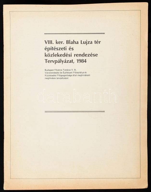 1984 Tervpályázat a VIII. ker. Blaha Lujza tér építészeti és közlekedési rendezésére. Budapest Főváros Tanács V.B. Városrendezési és Építészeti Főosztálya és Közlekedési Főigazgatósága. Bp., Interpress-ny., (24) p. Benne a díjazott pályaművek fekete-fehér fotóival. Tűzött papírkötés.