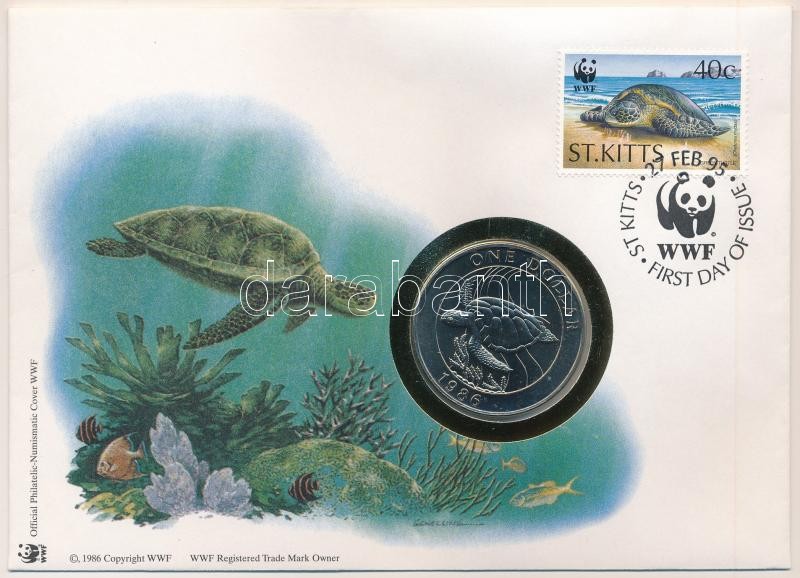 Kelet-Karibi Államok / St. Kitts boríték, benne Bermuda 1986. 1$ Cu-Ni "A Világ Vadvédelmi Alap (WWF) 25. évfordulója" forgalomba nem került emlékkiadás érmés borítékban, bélyeggel és bélyegzéssel T:1 kis patina