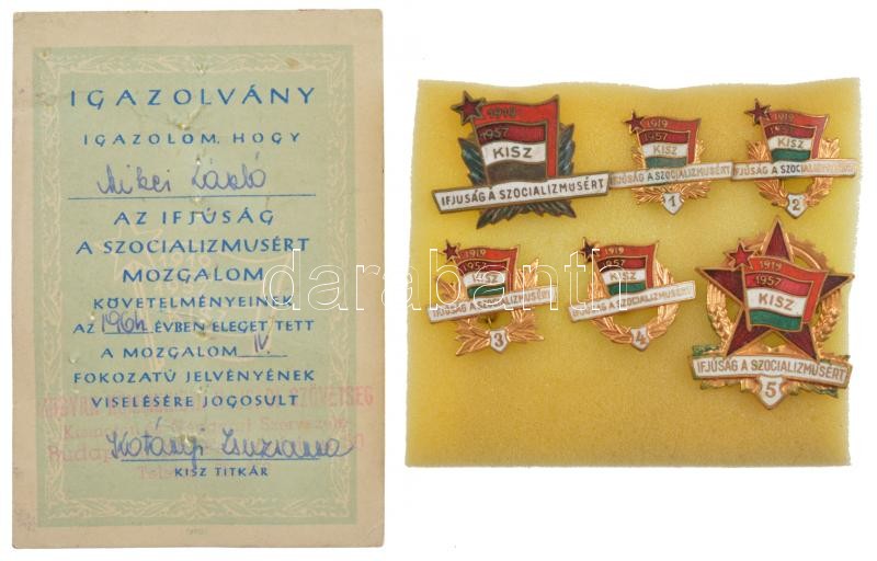 Leírás: 1964. "Ifjúság a Szocializmusért" zománcozott korai jelvénye + zománcozott, aranyozott jelvény 1-5 fokozatig (5xklf), viselői igazolvánnyal T:1-,2
