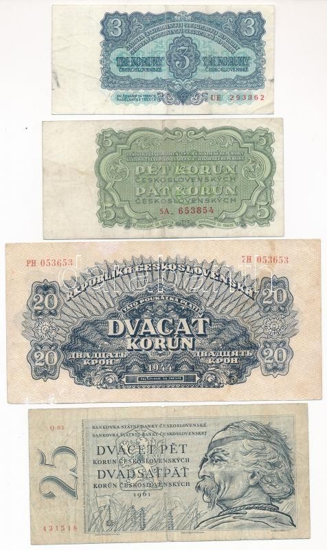 Czechoslovakia 1944. 20 Korún + 1961. 3 Koruny + 1961. 5 Korun + 1961. 25 Korun C:F,VG
