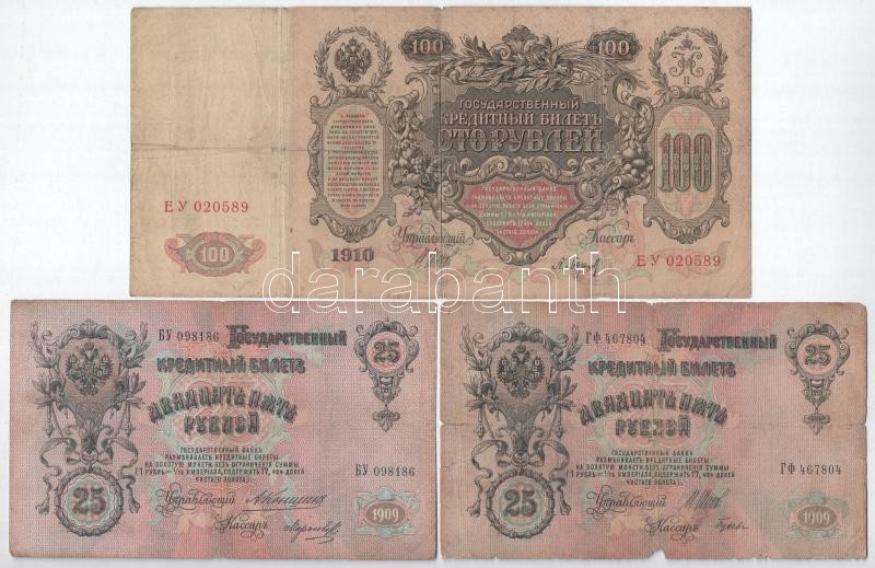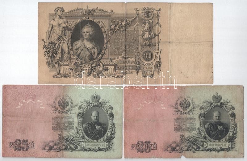 Leírás: Orosz Birodalom 1909-1912 (1909) 25R. Szign.:Konshin + 1912-1917 (1909) 25R. Szign.:Shipov + 1912-1917 (1910) 100R. Szign.: Shipov T:III,III- anyaghiány, szakadás