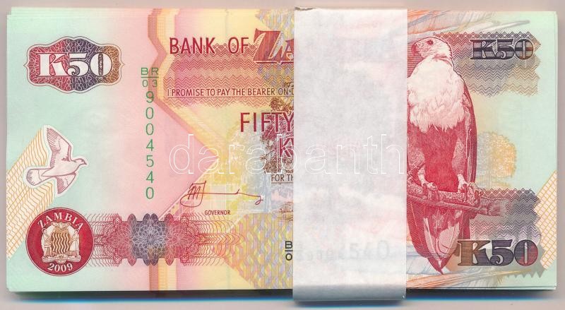 Leírás: Zambia 2009. 50K (61x) kötegelővel, sorszámkövetők T:I,I- Zambia 2009. 50 Kwacha (61x) in wrapper, consecutive serials C:UNC,AU Krause P#37