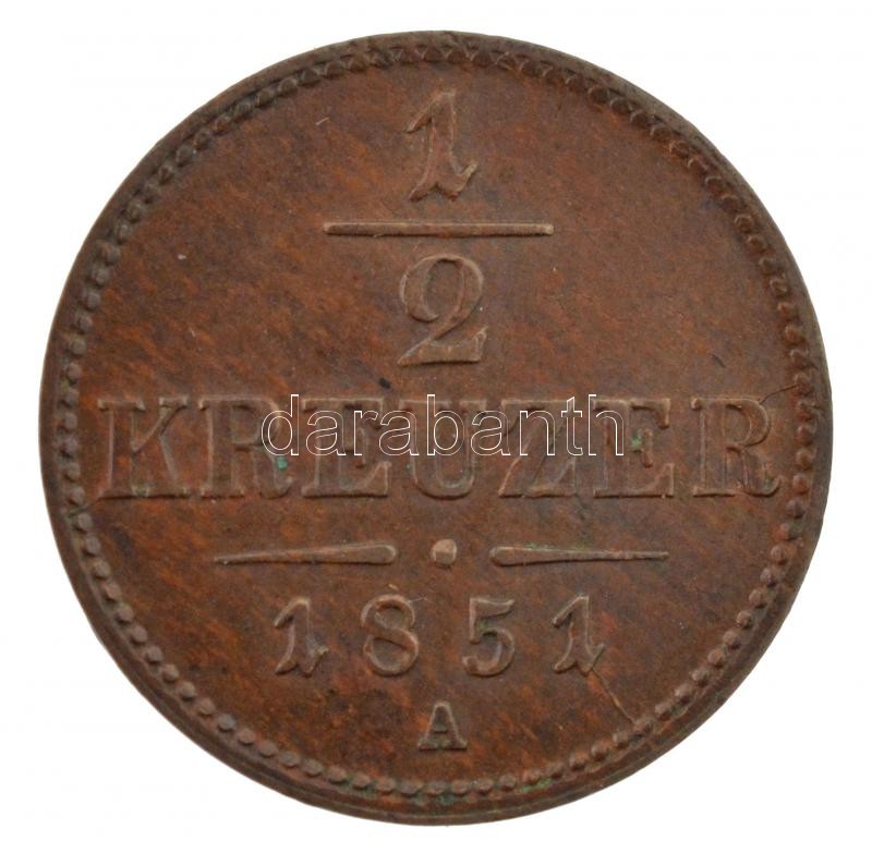 Ausztria 1851A 1/2kr Cu T:1- kis ph. Austria 1851A 1/2 Kreuzer Cu C:AU... https://www.darabanth.com/hu/427-Gyorsarveres/427.0/Numizmatika/Kulfoldi-fem-es-ezustpenzek~2000015/Ausztria-1851A-12kr-Cu-T1-kis-ph-Austria-1851A-12-Kreuzer-Cu-CAU-small-edge-error-Krause-KM2321~II2707321