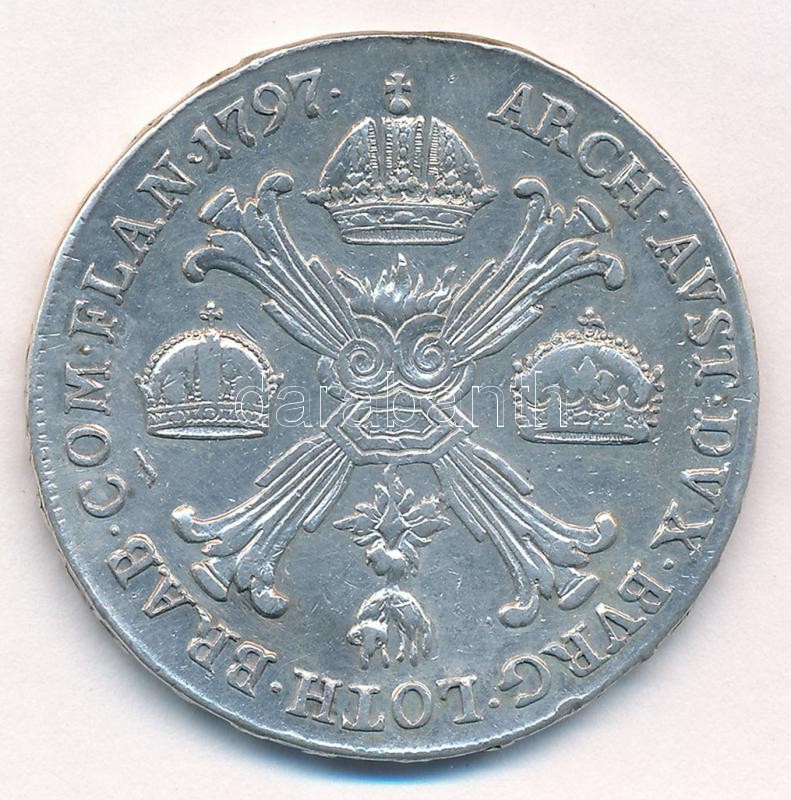 A... https://www.darabanth.com/hu/427-Gyorsarveres/427.0/Numizmatika/Kulfoldi-fem-es-ezustpenzek~2000015/Osztrak-Nemetalfold-1797B-1-Koronas-Taller-Ag-29-37g-T2-fulnyom-Austrian-Netherlands-1797~II2726599