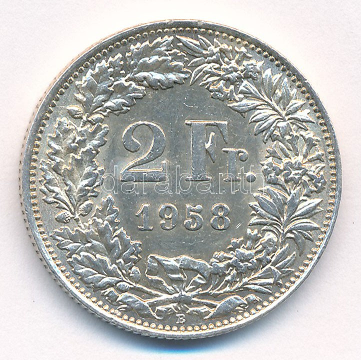 Krause KM#... https://www.darabanth.com/hu/427-Gyorsarveres/427.0/Numizmatika/Kulfoldi-fem-es-ezustpenzek~2000015/Svajc-1958-2Fr-Ag-T2-Switzerland-1958-2-Francs-Ag-CXF-Krause-KM2321~II2728389