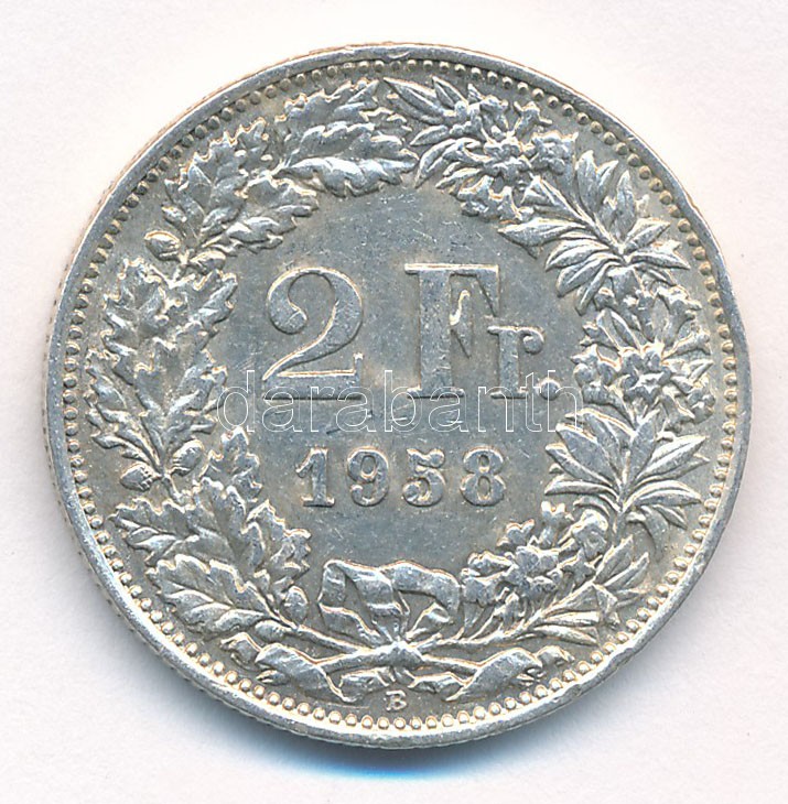 Krause KM#... https://www.darabanth.com/hu/427-Gyorsarveres/427.0/Numizmatika/Kulfoldi-fem-es-ezustpenzek~2000015/Svajc-1958-2Fr-Ag-T2-Switzerland-1958-2-Francs-Ag-CXF-Krause-KM2321~II2728391