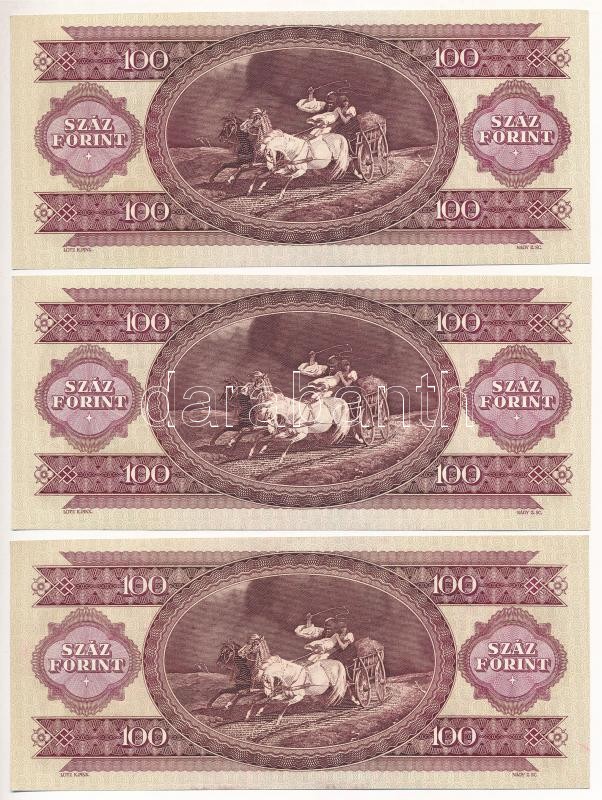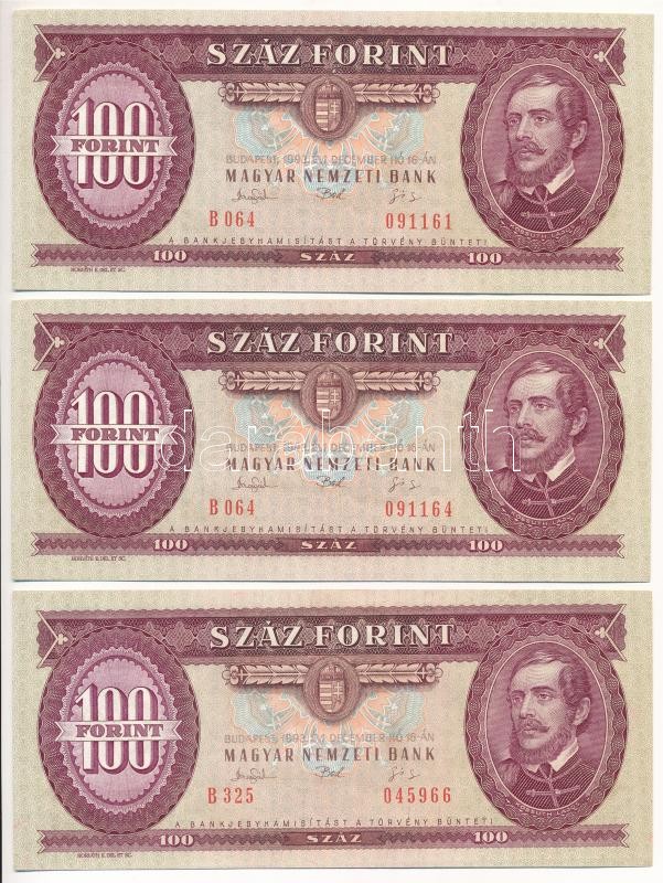 Hungary 1993. 100 Forint (3x) with close serial numbers C:UNC,AU