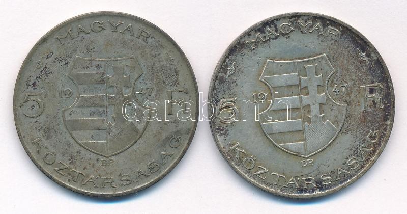 1947. 5Ft Ag "Kossuth" (2x) T:2-,3 patina Adamo F8.1 https://www.darabanth.com/hu/427-Gyorsarveres/427.0/Numizmatika/Magyar-es-magyar-verdejelu-fem-es-ezustpenzek~2000008/1947-5Ft-Ag-Kossuth-2x-T2-3-patina-Adamo-F81~II2704938