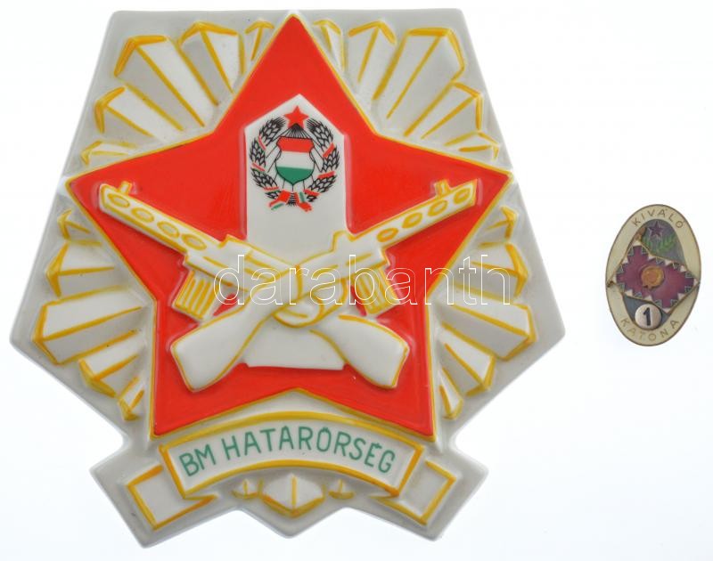 Leírás: ~1970. "BM Határőrség" jelzett hollóházi porcelán plakett eredeti dísztokban (151x158mm), mellette "Kiváló Katona" zománcozott jelvény T:1-