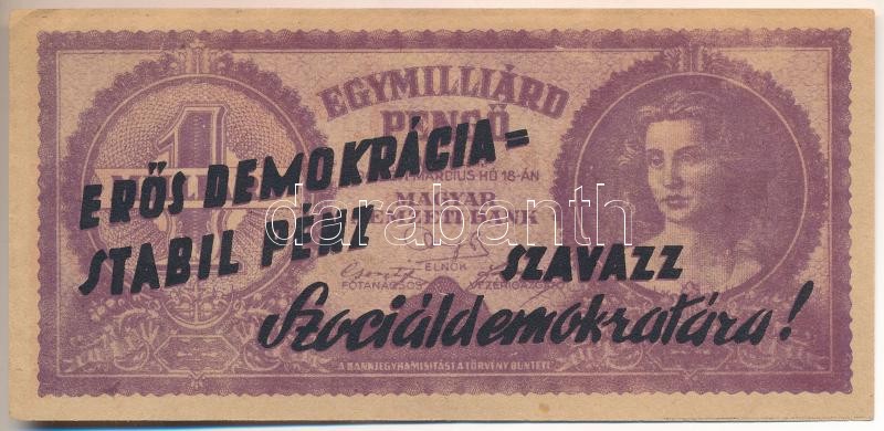 Leírás: 1946. Bankjegyszerű 1.000.000.000P-s röpcédula kétoldali "Erős demokrácia=Stabil pénz - Szavazz Szociáldemokratára!" propaganda felülnyomással T:II-,III