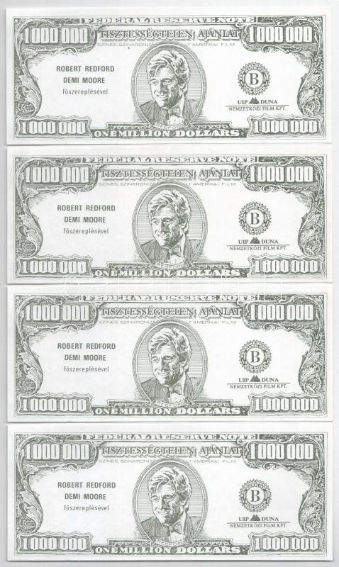 Leírás: ~1993. 1.000.000$ "Tisztességtelen ajánlat" fantázia bankjegy, filmreklám (4x) T:I--II