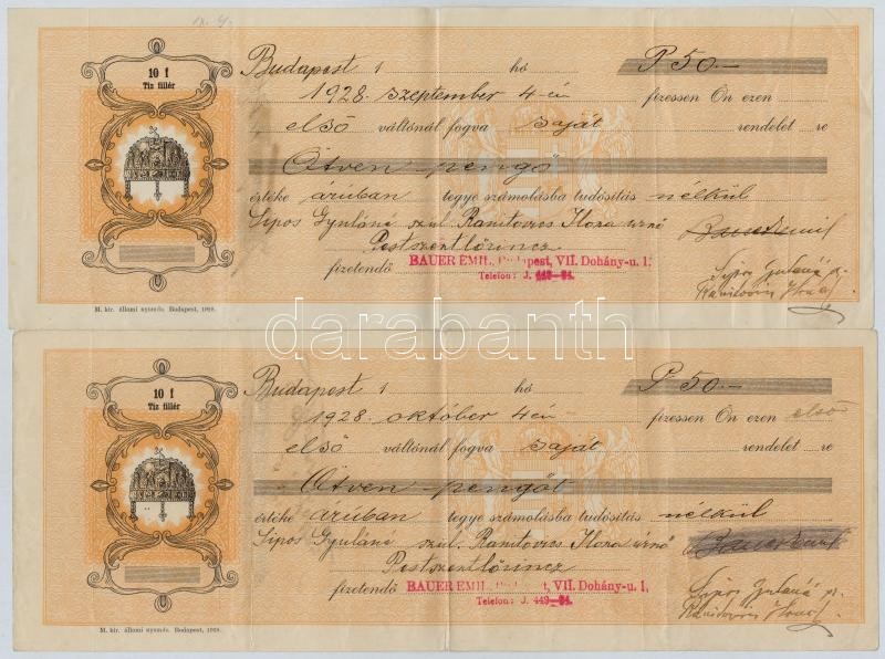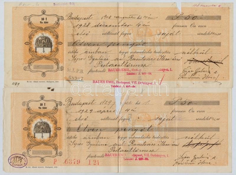 Leírás: Budapest 1928. 10db-os váltó tétel, egy része kitöltve, bélyegzésekkel T:III szakadás