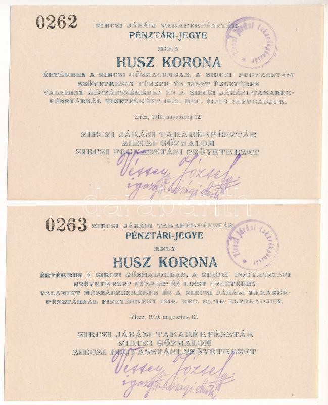 Zirc 1919. 10K "Zirczi Járási Takarékpénztár Pénztári-Jegye"... https://www.darabanth.com/hu/427-Gyorsarveres/427.0/Numizmatika/Papir-es-fem-szuksegpenzek~2000006/Zirc-1919-10K-Zirczi-Jarasi-Takarekpenztar-Penztari-Jegye-2x-sorszamkovetok-0262-0~II2730433