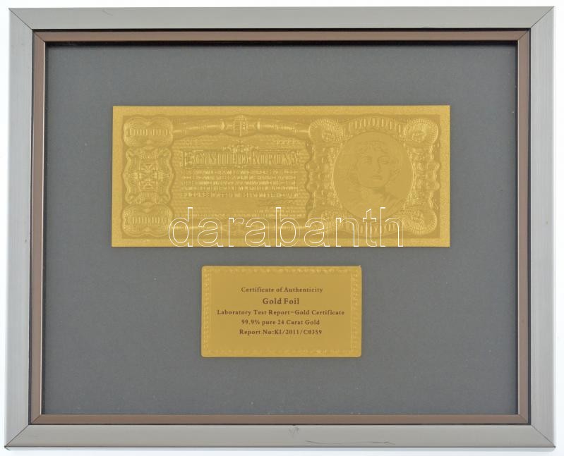 1923. 1.000.000K aranyozott, modern bankjegy replika, üvegezett keretben, tanúsítvánnyal T:I Hungary 1923. 1.000.000 Korona gold plated, modern banknote replica in glass frame with certificate C:UNC