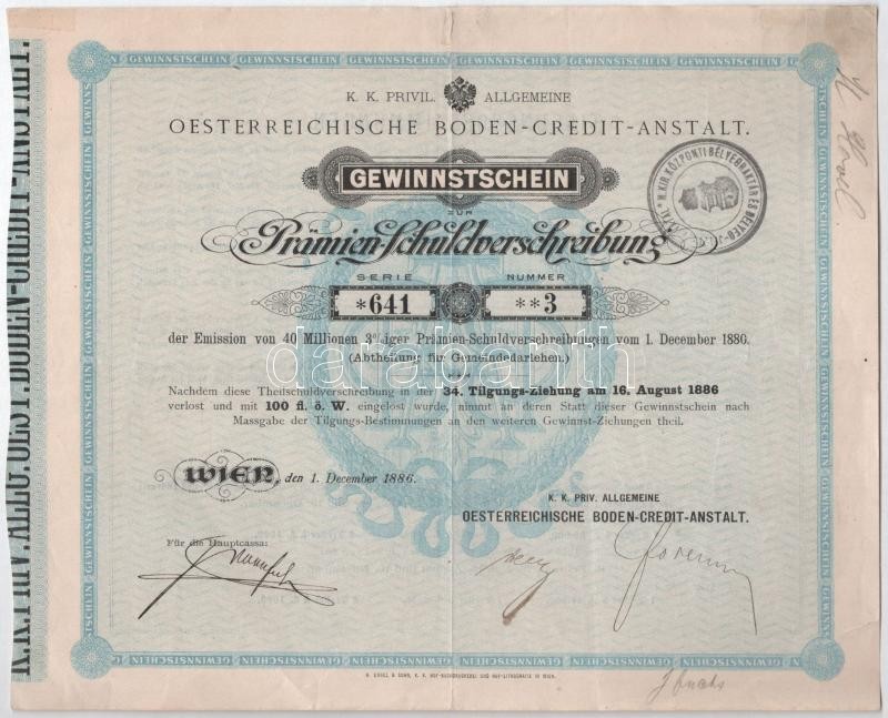 Ausztria / Bécs 1886. "Österreichische Boden-Credit-Anstalt - Gewinnstschein" prémium kötvénye 100 osztrák Florinról T:III