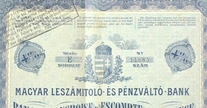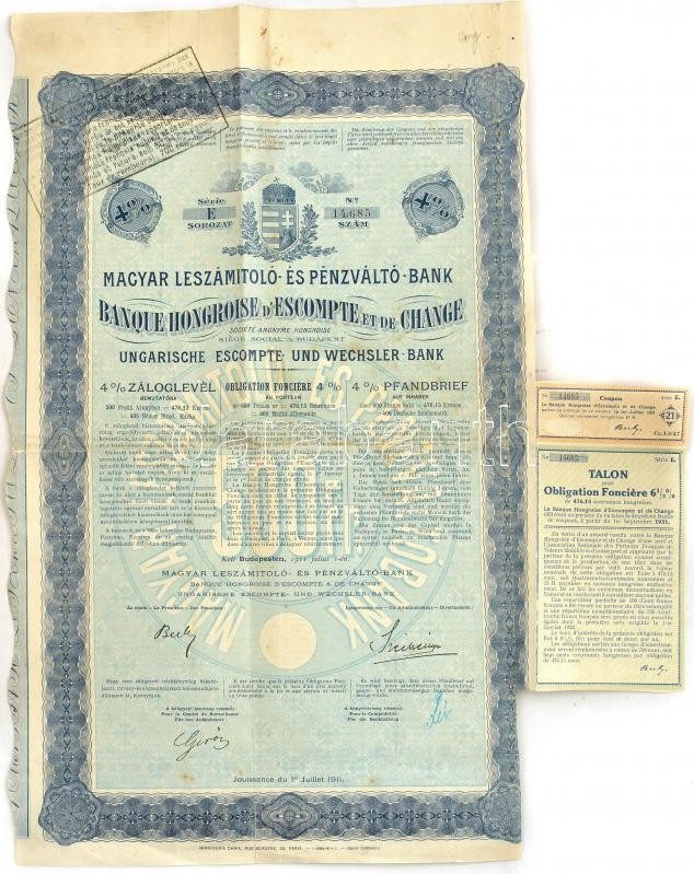 Leírás: Budapest 1911. "Magyar Leszámitoló- és Pénzváltó- Bank" 4%-kal kamatozó záloglevele 1db szelvénnyel, felülbélyegzéssel T:III tűlyukak