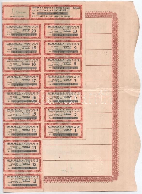Budapest 1938. "Nitrogen Műtrágya és Vegyiipar Részvénytársaság" tíz részvénye összesen 171P-ről, magyar, román és francia nyelven, szárazpecséttel, bélyegzésekkel és szelvényekkel T:II-