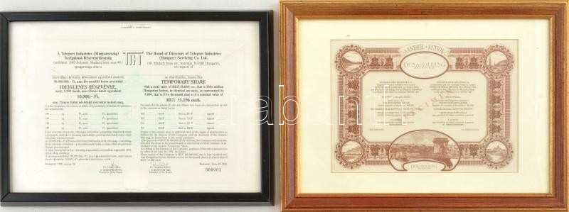 Leírás: Budapest 1990. 'A Teleport Industries (Magyarország) Szolgáltató Részvénytársaság" ideiglenes részvénye 10.000Ft-ról, "MINTA" + Belgium 1994. "Dunaholding Belgium" minta részvénye "SPECIMEN", mindkettő bekeretezve T:I
