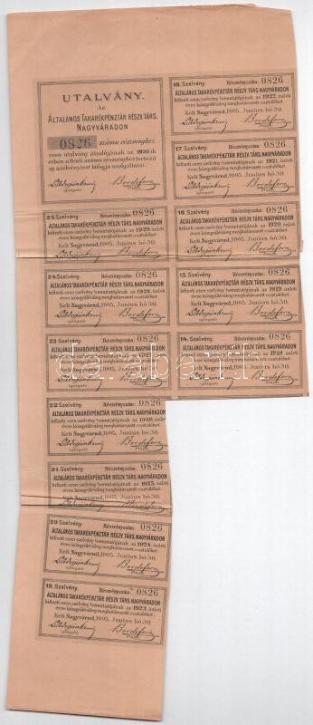 Nagyvárad 1905. "Általános Takarékpénztár Részvénytársaság" ... https://www.darabanth.com/hu/427-Gyorsarveres/427.0/Numizmatika/Reszvenyek-es-sorsjegyek~2000005/Nagyvarad-1905-Altalanos-Takarekpenztar-Reszvenytarsasag-nevre-szolo-reszvenye-200~II2735241