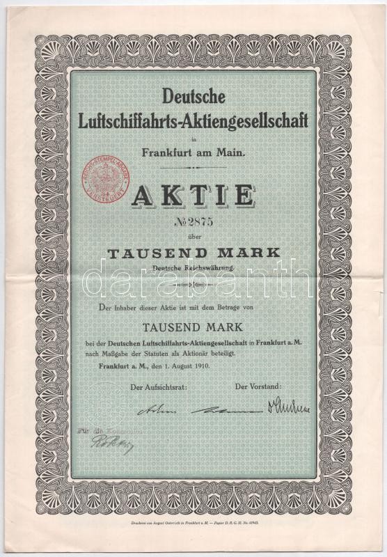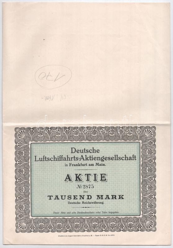 German Empire / Berlin 1910. "Deutsche Luftschiffahrts-Aktiengesellschaft" share about 1000 Mark with embossed stamp, coupons and cancellation C:VF small tear