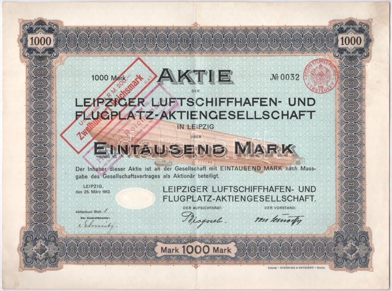 German Empire / Berlin 1913. "Leipziger Luftschiffhafen- und Flugplatz Aktiengesellschaft" share about 1000 Mark with embossed stamp and cancellations C:F spotted