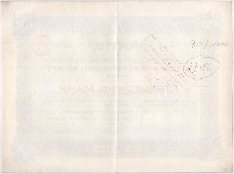 Német Birodalom / Berlin 1913. "Lipcsei Léghajó- és Repülőtér-Részvénytársaság Lipcsében" részvény 1000M-ról szárazpecséttel, bélyegzésekkel T:III fo.
