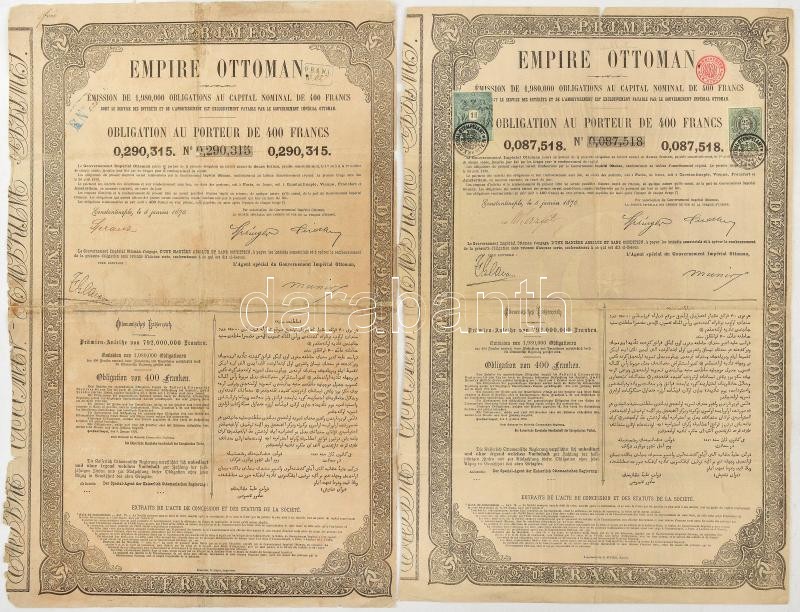 Oszmán Birodalom / Konstantinápoly 1870. Kötvény 400Fr-ról osztrák bélyeggel és bélyegzéssel + 1870. Kötvény 400Fr-ról bélyeg és bélyegzés nélkül T:III,IV egyik ragasztva Ottoman Empire / Constantinople 1870. Bond about 400 Francs with Austrian stamp and overprint + 1870. Bond about 400 Francs without stamp and overprint C:F,G one with gluetape