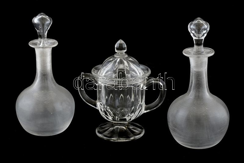 Leírás: 3 db üvegtárgy (olajos üveg, serleg formájú fűszertartó), jelzés nélkül, m: 11 - 15 cm