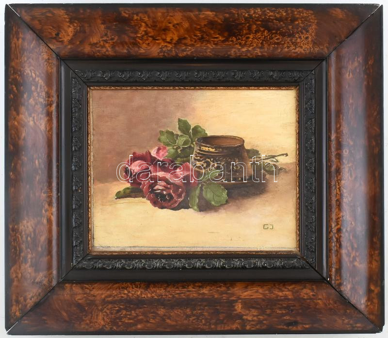Leírás: GJ jelzéssel: Virágcsendélet. Olaj, karton. Dekoratív, kissé sérült fakeretben. 24×30,5 cm