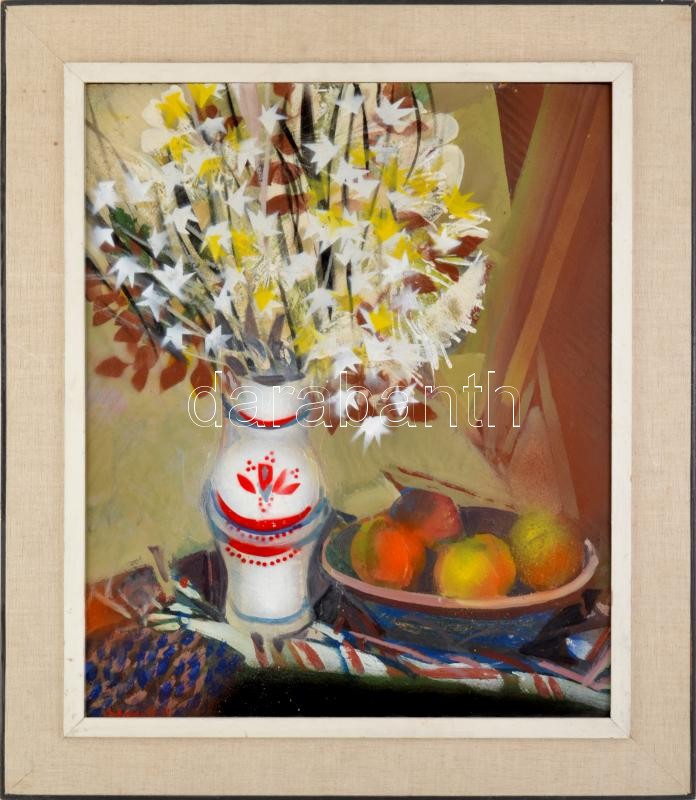 Leírás: Dobrovits Ferenc (1941-1988): Csendélet. Olaj, farost, jelzett. Hátoldalán autográf felirattal és ajándékozási sorokkal. Dekoratív keretben. 60x50 cm