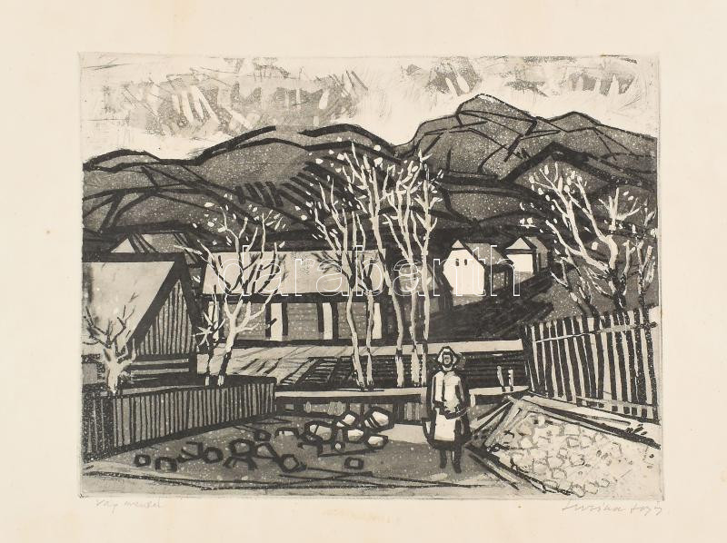 Leírás: Luzsicza Lajos (1920-2005): Vág-völgyében. Aquatinta, papír. Jelzett, . 30x40 cm Kissé foltos a lap széle