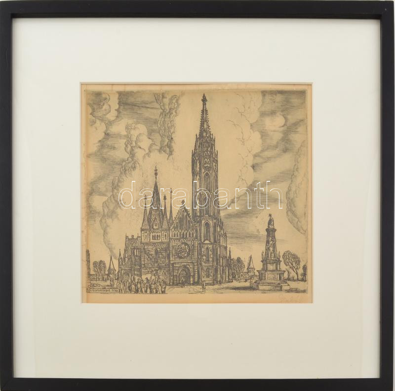 Szabó Vladimír (1905-1991): A Szentháromság téren. Rézkarc, papír, jelzett. Lap széle foltos. Üvegezett fakeretben, hátoldali üvegen repedéssel. 23×28 cm
