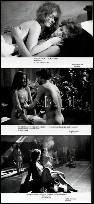Különböző időpontokban készült magyar filmek egy-egy szolidan erotikus jelenetei, 3 db vintage produkciós filmfotó, ezüst zselatinos fotópapíron, az idegen nyelvű felirat arra utal, hogy a Hungarofilm külföldi terjesztésre szánta a promóciós fotókat, 13x18 cm