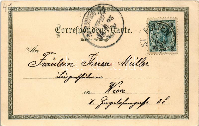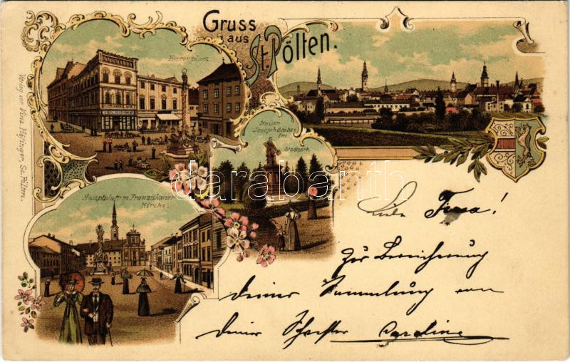 1899 (Vorläufer) Sankt Pölten, Rathausplatz, Landes Lehrer-Seminar, Einquartierungshaus mit Kaiser Josef Denkmal, Englisches-Stift, Hotel Pittner. Regel & Krug Art Nouveau, floral, litho (EK)