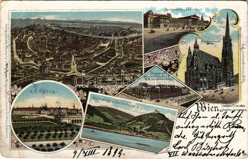 1899 (Vorläufer) Wien, Vienna, Bécs; K.k. Hofburg, Kahlenberg u. Leopoldsberg, Reichsratsgebäude, Stefansdom, Universität / castle, court, church, university. Geographische Postkarte v. Wilh. Knorr Art Nouveau, floral, litho (EB)