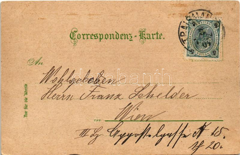 Leírás: 1904 Traismauer, Träsmavr 1672. Neue Schule. Druck v. Louis Glaser Art Nouveau, floral, litho (fa)