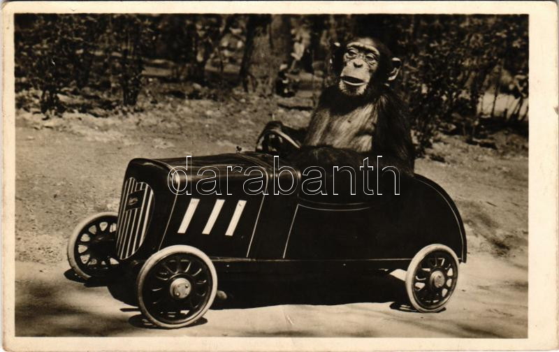 Csimpánz gépkocsiban, Kiadja Budapest székesfőváros állat- és növénykertje. Hölzel Gyula felvétele / Chimpanzee driving an automobile, humour, Budapest Zoo