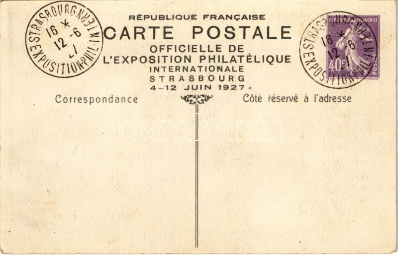 Leírás: 1927 Exposition Philatelique Internationale, Strasbourg, Palais du Rhin / International Philatelic Exhibition advertisement card + So. Stpl s: L. Ph. Kamm