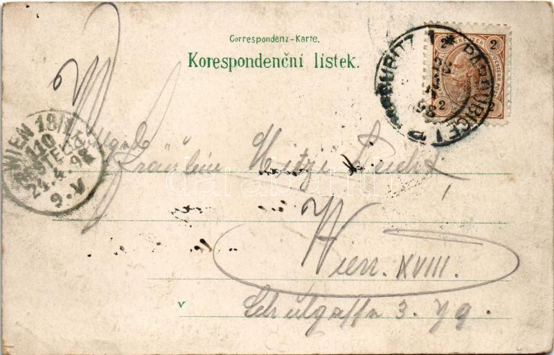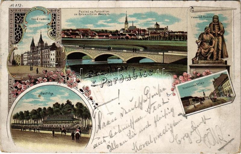 Leírás: 1898 (Vorläufer) Pardubice, Nová radnice, Veverku Pomnik, Dostihy, Kralovska Frída / new town hall, railway bridge, monument, horse racing. Art Nouveau, floral, litho (pinhole)