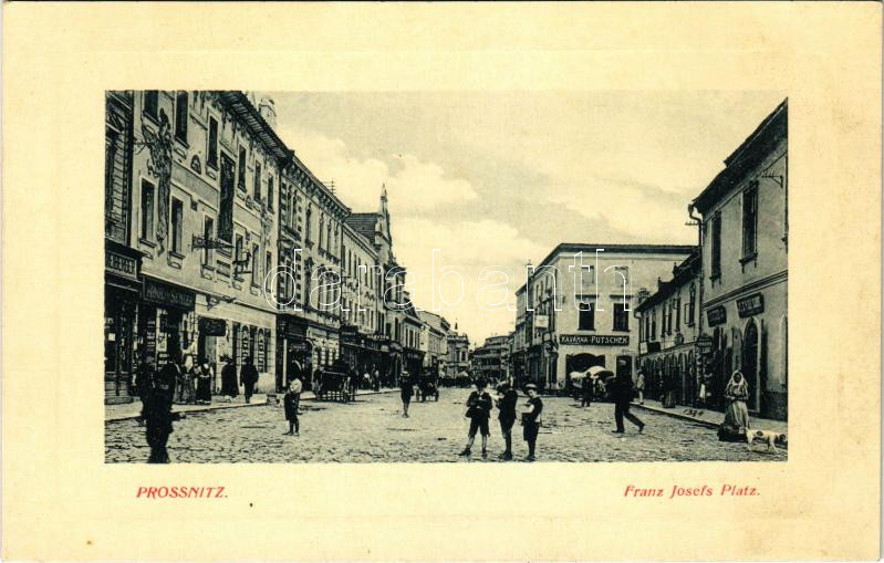Leírás: Prostejov, Prossnitz; Franz Josefs Platz, Kavarna Putschek / square, café, shops. W.L. Bp. 3044.