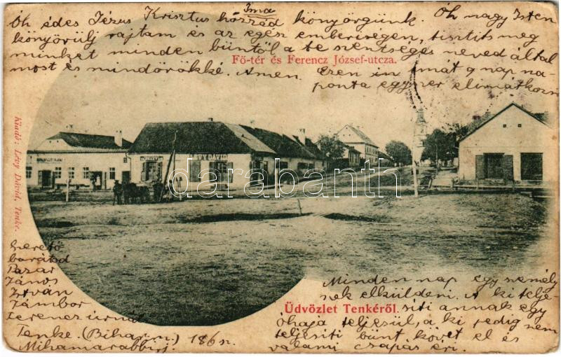 Leírás: 1900 Tenke, Tinca; Fő tér, Ferenc József utca, Vasraktár, Rosenfeld Lajos és Lévy Dávid üzlete. Lévy Dávid saját kiadása / street view with shops (EK)